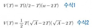 상자의 가로, 세로의 길이를 각각 l , w 라 두면 상자의 부피는 <수식1>과 같다. 사각형의 넓이가 A 로 일정할 때, T 값을 고정하고 최대인 경우를 생각해 보면 (수식 1)인 경우이므로 상자의 부피는 <수식2>와 같이 되고 (수식 2) 일 때 최대 부피 (수식 3) 이다. 직사 ▤活?넓이를 A=144 로 정하면 상자의 최대부피는 64이다.