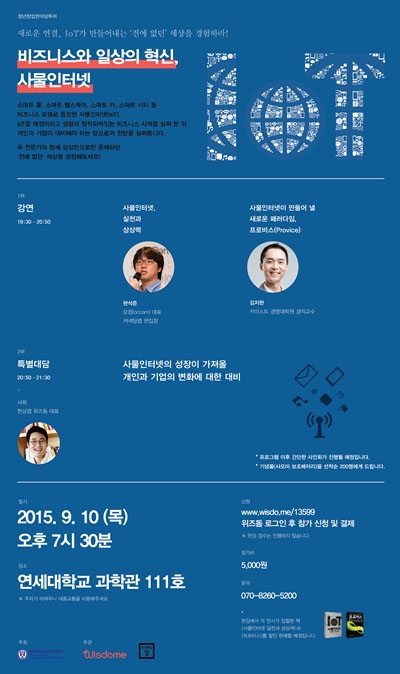 오는 9월 10일(목) 연세대학교 과학관에서 개최되는 ‘비즈니스와 일상의 혁신, 사물인터넷(IoT)’ 강연은 연세대학교 창업지원단(단장 손홍규)이 주최하고 소셜벤처 위즈돔(공동대표 한상엽·김종석)과 출판사 미래의창(대표 성의현)이 주관한다.