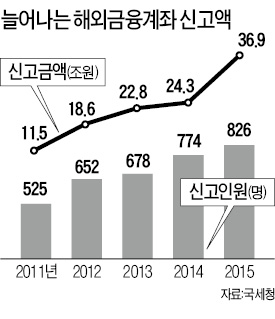 2011년 도입된 해외금융계좌 신고제도에 따라 매월 말 기준으로 한 번이라도 10억원을 초과하는 예금·주식·파생상품 계좌를 보유한 개인과 법인은 이듬해 5월 말까지 국세청에 계좌 내역을 신고해야 한다. 2011년 첫 신고 당시 11조5000억원(525명), 2012년 18조6000억원(652명), 2013년 22조8000억원(678명) 등 해마다 증가세를 보이고 있다.