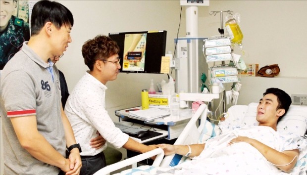 LIG넥스원(대표 이효구)은 북한의 지뢰 도발로 중상을 당해 입원 치료 중인 하재헌 하사(21)와 김정원 하사(23)에게 그간 임직원이 모은 1000만원의 치료비와 간병비를 각각 지원했다. 제2연평해전에서 부상을 입고 전역한 뒤 LIG넥스원에서 근무 중인 고정우 씨(34·PM3팀·왼쪽부터)와 곽진성 씨(36·PM2팀)는 하 하사를 위로한 뒤 지원금을 전달했다. 곽씨는 하 하사에게 “제2연평해전 때 파편상을 당해 고통을 겪었다”며 “파편을 제거하는 수술이 얼마나 고통스러운지 잘 안다. 용기를 잃지 마라”고 당부했다.