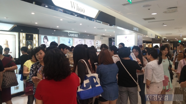 아모레퍼시픽의 '설화수'와 LG생활건강의 '후' 등 고가 브랜드에서는 여러세트를 한꺼번에 사들이는 요우커들이 많았다. 점원들은 주요 제품 모델과 가격이 표시된 팸플릿을 요우커들에게 나눠주고 구입 목록을 기입하느라 바삐 움직였다.