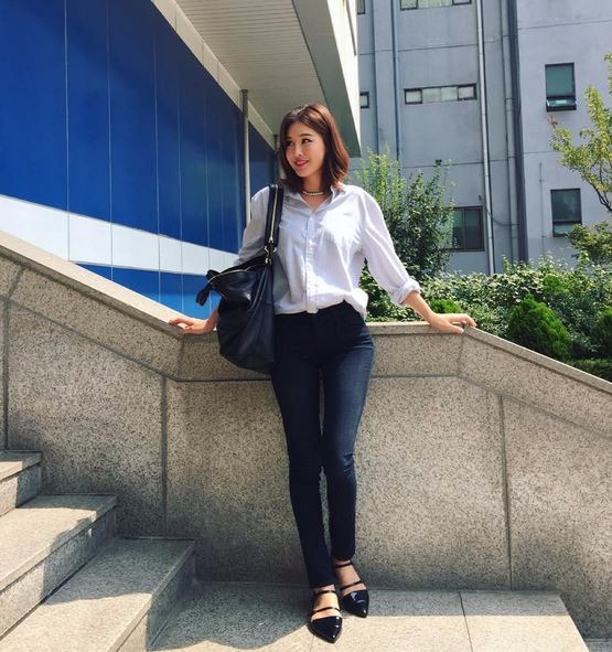 사진 속 박은지는 청스키니진을 입고 오버사이즈 셔츠를 입은 채 난간에 기대어 서있다. 박은지의 작은 얼굴과 날씬한 몸매, 쭉 뻗은 각선미가 사람들의 시선을 사로잡고 있다.