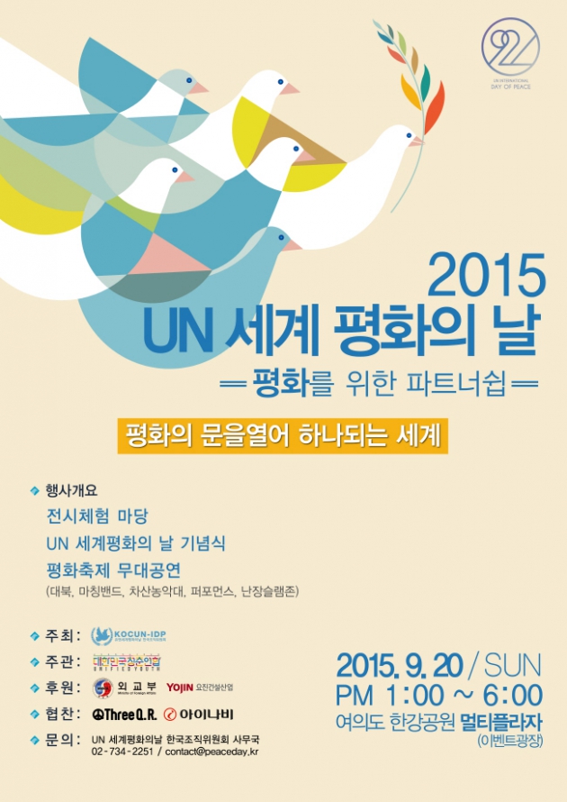 매년 9월 21일은 UN이 정한 ‘세계평화의 날’이다. ‘세계평화의 날’ 을 기념하기 위해 오는 9월 20일 일요일 오후 1시에서 6시까지 여의도 한강공원 멀티플라자에서 기념공연 및 평화체험부스행사가 진행된다. 본 행사는 UN IDP(유엔 공보국)의 요청으로 시작되어, ‘유엔 세계평화의 날 한국조직위원회’ 가 2008년부터 주최해 오고 있으며, 2012년부터 외교부가 공식 후원하고 있다.