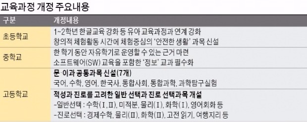 중학교 교육과정은 내년부터 전면 시행하는 자유학기제를 대비해 ‘진로탐색활동’과 ‘주제선택활동’ 등을 교과 및 창의적 체험활동과 연계했다. 초등학교에서는 한글 교육을 강화한다. 1~2학년의 한글 교육을 최소 45시간으로 강화한다. 1~2학년에 주당 1시간씩 ‘안전한 생활’을 통해 교통, 신변, 재난안전 과목을 단계적으로 배정하는 등 안전교육을 강화했다.