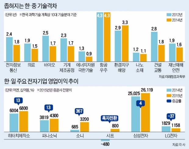 황철성 서울대 반도체연구소장은 “메모리반도체의 핵심 기술을 지닌 일본 엔지니어들이 지금 상당수 중국으로 넘어간 상황”이라며 “설계가 크게 어렵지 않기 때문에 단기간 대규모 투자를 하면 10년 이내에도 추격당할 수 있다”고 경고했다. 스마트폰, TV 등 완제품의 상황은 더욱 어렵다. 불과 3년 전만 해도 중국 스마트폰 시장 1위였던 삼성전자가 지금은 5위권 밖으로 밀려난 것이 대표적이다. LG그룹의 기술개발을 총괄하는 이희국 (주)LG 기술협의회 의장은 “과거엔 중국 업체의 수준이 한국보다 떨어질 뿐 아니라 소비자의 기대치에도 못 미쳤다”며“한국과 중국 제품 모두 소비자의 기대치를 어느 정도 충족하고 있어 기술보다는 가격이 판매에 더 중요한 변수”라고 설명했다.