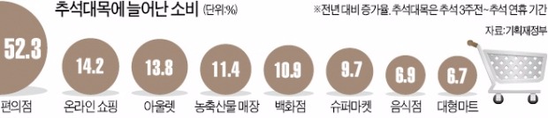 기획재정부는 4일 ‘최근 내수회복 관련 동향’ 자료를 통해 “지난 ‘추석 대목’(추석 3주 전~추석 연휴, 9월7~29일)에 전국 주요 유통업체의 매출이 작년보다 눈에 띄게 늘어났다”고 발표했다. 편의점 매출은 지난해 추석 대목(8월18일~9월10일)보다 52.3% 급증했다. 담뱃값 인상효과(30%가량)를 제외하더라도 20% 이상 매출이 늘었다는 게 기재부의 분석이다. 같은 기간 온라인 쇼핑과 아울렛의 매출도 각각 14.2%와 13.8% 증가했다. 백화점(10.9%)과 슈퍼마켓(9.7%) 대형마트(6.7%) 등 다른 유통업계 매출도 모두 작년보다 늘었다.품목별로는 개별소비세율이 인하된 자동차와 가전제품의 판매량 증가세가 두드러졌다. 지난달 국산 승용차 판매량은 전년 동기보다 15.5% 증가했다. 주요 가전업체의 대형 TV(개별소비세율 인하 대상인 60인치 이상 기준) 판매량도 같은 기간 20% 이상 늘어난 것으로 조사됐다.