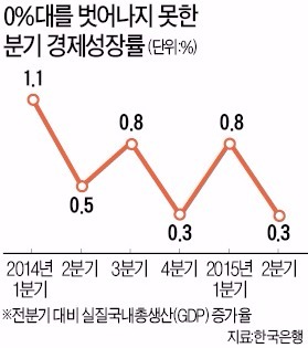 전기 대비 실질 국내총생산(GDP) 증가율은 지난해 1분기 1.1%를 기록한 이후 5분기 연속 0%대를 벗어나지 못했다. 지난 2분기에는 메르스(중동호흡기증후군) 확산과 가뭄으로 민간 소비가 뒷걸음질친 데다 수출까지 감소하면서 1분기(0.8%)보다 0.5%포인트 낮은 0.3%로 떨어졌다.