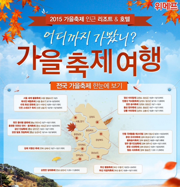 오유진 위메프 통합숙박팀장은 "미처 가을 여행을 계획하지 못한 고객들을 위해 가을 축제와 인근에 위치한 호텔과 리조트를 엄선해서 이번 기획전을 준비했다"고 말했다.