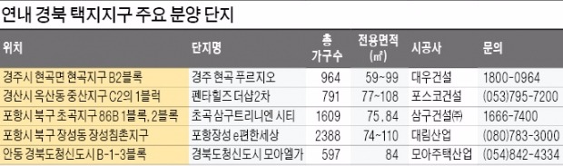 연내 경북 택지지구 또는 도시개발구역에서 공급되는 물량은 경주 현곡지구(964가구), 경산 중산지구(791가구), 포항 장성침촌지구(2388가구), 포항 초곡지구(1609가구), 경북도청이전신도시(597가구) 등 5개 단지 총 6349가구다. 민간이나 지방자치단체가 주도해 주거, 상업, 문화 등 자족 기능을 갖춘 계획도시로 조성하는 단지가 대부분이다. 해당 지역에서 오랜만에 나오는 아파트 물량이어서 실수요자들의 관심이 많다. 전매제한이 없어 투자자도 관심을 보이고 있다고 인근 중개업소들은 전한다.