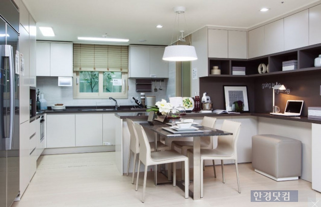주방에는 확장시 아일랜드 식탁이 시공된다. 맘스데스크로 사용할 수 있는 장도 설치된다. 상부에도 장이 있어서 활용성이 높을 전망이다.