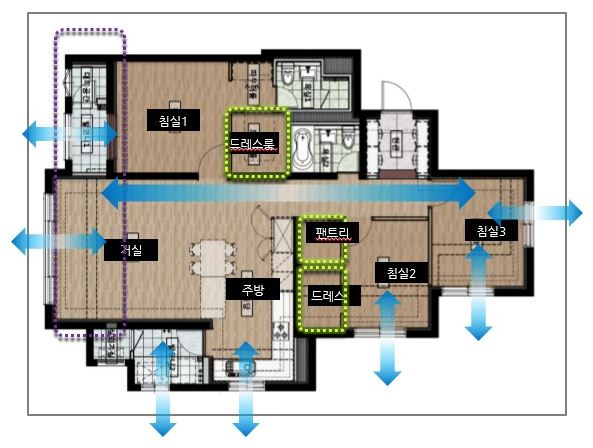더불어 거실과 자녀방의 창을 열어놓으면 맞통풍이 가능하다. 탑상형은 '통풍이 안되서 생선도 못 굽는다'는 고정관념을 깨는 설계다. 탑상형은 기존에 각 동에서 끼인 평면이었지만 이 평면은 가장자리인 1호 라인에 배치하면서 이러한 설계가 가능했다는 게 대우건설측의 설명이다.