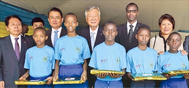 이 회장은 또 “아리랑과 고향의 봄, 졸업식 노래를 처음 밟는 아프리카 땅에서 들으니 감사와 벅찬 감정을 느낀다”며 “몇백 년, 몇천 년 후에도 이역만리 한국과 르완다에서 같은 노래가 울려 퍼지길 기대한다”고 말했다. 학생 대표로 나선 8세 여아가 서툴지만 낭랑한 영어로 감사 인사를 전하자 이 회장의 얼굴에 한없이 인자한 미소가 흘렀다.