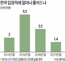 내년부터 2년 동안 현역병 정원이 2만명 늘어나며 산업기능요원도 3년간 2000명씩 중소기업에 추가 배정된다.정부와 새누리당은 27일 국회에서 당정협의회를 열고 이 같은 방안을 추진하기로 했다. 당정은 ‘입대전쟁’으로 일컬어지는 현역병 입대 적체 현상을 완화하기 위해 내년도 관련 예산 600억원을 추가 투입해 내년 1만명, 2017년 1만명의 현역 신병을 추가로 받아들이기로 했다. 지난해 말 현재 입대를 희망하고도 입영하지 못한 청년은 약 2만명이었으나 올 연말에는 약 5만2000명으로 늘어날 것으로 병무청은 추정하고 있다. 군당국이 병사 감축 계획에 따라 현역 입영 규모를 2013년 27만2000명 수준에서 올해 25만명 수준으로 줄인 반면 1994년과 1995년에 태어난 남아들은 많았고 취업난 여파로 병역의무를 빨리 마치려는 수요까지 늘어났기 때문이다.