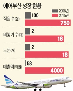 에어부산은 2008년 10월27일 부산~김포 노선에 취항하면서 출발했다. 당시 항공기는 2대, 직원은 100여명이었다. 이후 비행기 한 대를 추가 도입해 부산~제주 노선에 취항하면서 취항 첫해인 2008년 58억원의 매출을 올렸다. 7주년을 맞은 현재 에어부산은 항공기 15대, 전체 직원 760여명으로 성장했다. 국내선 3개, 국제선 15개 노선을 운항하고 있다.