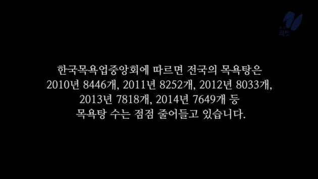한국목욕업중앙회에 따르면 전국의 목욕탕은 2010년 8446개, 2011년 8252개, 2012년 8033개, 2013년 7818개, 2014년 7649개 등으로 점점 줄고 있습니다.