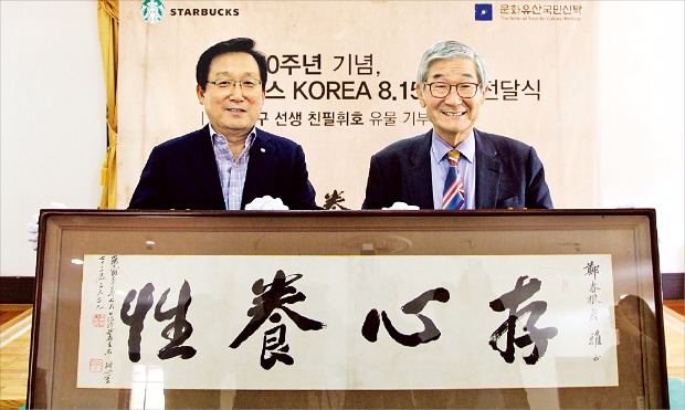 스타벅스는 광복 70주년을 기념해 지난 15일 덕수궁 중명전에서 백범 김구 선생의 유물을 문화유산국민신탁에 기부했다. 광복절인 지난 8월15일 전국 매장에서 출시한 ‘2015 코리아 8·15 머그, 텀블러, 카드’를 판매한 수익금으로 기금을 조성, 백범의 ‘存心養性(존심양성)’ 친필휘호 유물을 구입해 기부했다. 이 유물은 덕수궁 중명전에서 특별 전시될 예정이다.