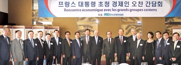 전국경제인연합회는 4일 서울 그랜드하얏트호텔에서 ‘프랑수아 올랑드 프랑스 대통령 초청 경제인 오찬 간담회’를 열었다. 왼쪽부터 류진 풍산 회장, 서경배 아모레퍼시픽 회장, 허영인 SPC 회장, 황창규 KT 회장, 이형근 현대자동차 부회장, 박진수 LG화학 부회장, 박상진 삼성전자 사장, 신창재 교보생명 회장, 신동빈 롯데 회장, 로랑 파비우스 프랑스 외교부 장관, 올랑드 대통령, 허창수 전경련 회장, 조양호 한진 회장, 손경식 CJ 회장, 플뢰르 펠르랭 프랑스 문화통신부 장관, 김윤 삼양홀딩스 회장, 이홍구 한글과컴퓨터 부회장, 김상헌 네이버 대표.