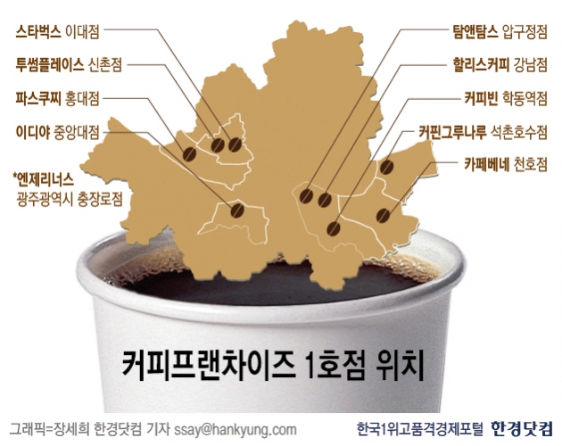 [ 김아름 기자 ] 국내 주요 커피 프랜차이즈 1호점은 대부분 강남·대학가에 위치한 것으로 나타났다. 1호점이 서울 외 지역에 있는 곳은 엔제리너스 뿐이었다.