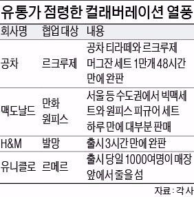 유통가에 컬래버레이션 열풍이 불고 있다. 일상생활에서 쉽게 접할 수 있는 대중적 브랜드들이 최고급 명품 브랜드와 함께 제품을 판매하거나 과거의 향수를 불러일으키는 캐릭터 상품과 협업하는 식이다.