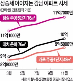 서울 강북과 수도권의 중저가 아파트가 가을 들어 조정에 들어간 것과는 달리 서울 강남 3구(강남·서초·송파구)의 재건축 대상 아파트는 대부분 높은 몸값을 유지하고 있는 것으로 나타났다. 재건축이 착착 진행되고 있는 데다 최근 강남권에서 나온 일반분양분이 3.3㎡당 4000만원을 넘는 고분양가에도 높은 청약률을 기록해서다.대치동 은마아파트 전용 76㎡의 매매가격은 5년여 만에 10억원대에 재진입했다. 9층에서 나온 매물이 지난 2일 10억2000만원에 거래됐다. 지난달 서울시에 실거래 신고를 마친 전용 76㎡ 3가구 중 2가구도 각각 9억9000만원과 9억8000만원에 팔렸다.