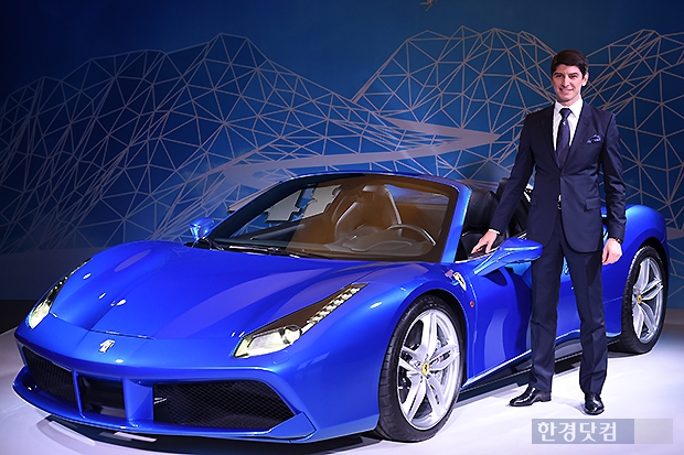 [ 변성현 기자 ] 이탈리아 슈퍼카 브랜드 페라리는 17일 오전 서울 논현동 인터와이드 스튜디오에서 오픈톱 고성능 '488 스파이더' 사진 행사를 갖고 공식 출시했다. 레노 데 파올리 페라리 한국-일본 총괄 디렉터사 포즈를 취하고 있다.