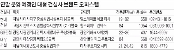 20일 건설업계에 따르면 시공능력평가 10위 내 대형 건설업체가 연내 분양하는 브랜드 오피스텔은 5곳 3616실이다. 현대건설은 이달 경기 하남 미사강변도시와 고양 일산신도시에서 힐스테이트 브랜드를 단 오피스텔 2개 단지, 1704실을 내놓는다. GS건설도 경기 광명역세권지구에 ‘광명역 파크자이2차’를 선보일 예정이다.