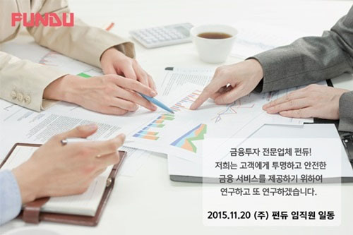 오늘(11월 25일)부터 ㈜펀듀의 P2P 투자 사업 첫 투자자 모집이 시작되며, 보다 자세한 사항은 홈페이지( www.fundu.kr )를 통해 확인 가능하다.
