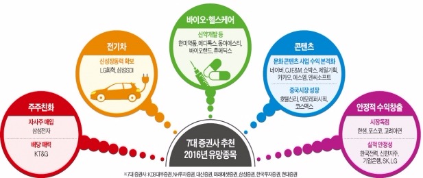26일 한국경제신문이 NH투자증권 KDB대우증권 삼성증권 한국투자증권 현대증권 미래에셋증권 대신증권(이상 자산 순위) 등 7개 증권사가 선정한 ‘2016년 톱픽’ 146개 회사를 분석한 결과 5군데 이상 증권사로부터 추천된 종목은 삼성전자, 한국전력, 아모레퍼시픽, SK이노베이션, CJ E&M, 네이버, LG화학, SK, 한미약품 등 9개로 나타났다.