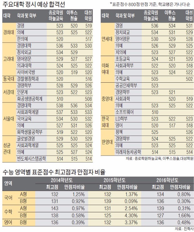2016학년도 대입 정시모집에서 서울대 경영대에 지원하려면 표준점수 합계가 534점, 연세대와 고려대 경영대는 530점 이상은 돼야 할 것이란 전망이 나왔다. 올해 대학수학능력시험이 역대 최악의 ‘물수능’이란 평가를 받았던 지난해보다 난이도를 다소 까다롭게 조절하면서 합격선이 작년보다 올라갈 것이라는 예상이다. 수능 채점 결과 작년에 지나치게 쉬웠던 수학B형, 영어 등의 만점자 비율은 크게 줄었다.◆주요대 의대 522점 넘어야