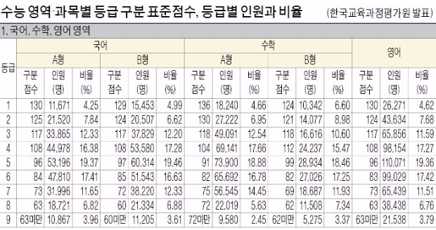 수능 채점 결과 영역별 표준점수 최고점(원점수 만점)은 국어A형 134점, 국어B형 136점, 수학A형 139점, 수학B형 127점, 영어 136점으로 나타났다. 표준점수는 자신의 원점수가 평균 성적에서 얼마나 떨어졌는지를 나타내는 지표다. 시험이 어려워 평균이 낮으면 표준점수 최고점이 높아지고 평균이 높으면 표준점수 최고점은 낮아진다. 수학A형과 수학B형의 표준점수 최고점은 작년보다 각각 8점과 2점 높아졌고 영어는 4점 높아졌다.