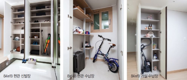 전용 84㎡B는 4베이 판상형 구조다. 나란히 붙어 있는 자녀방 2개소 사이에는 가변형 벽체가 있다. 소비자들의 선택에 따라 2개의 방을 통합해서 사용할 수 있다. 자녀방 1개소에는 붙박이장이 기본으로 설치된다.