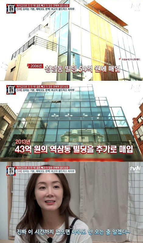 또 청담동에 구입한 50억대의 빌딩은 현재 시세 100억원대로 뛰어올랐으며, 2013년 매입한 43억원의 역삼동 빌딩은 50억원으로 올랐다. 최지우는 빌딩 두 채로 달마다 수천만원의 임대수익을 얻고 있다.