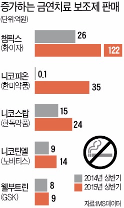 올 들어 정부의 금연정책이 본격화되면서 금연치료제와 보조제(패치, 껌, 사탕) 등 관련 시장이 가파른 성장세를 보이고 있다. 정부 지원으로 약값 부담이 절반 수준으로 줄어든 금연치료제 처방은 지난해보다 약 200% 급증했다.9일 시장조사기관인 IMS데이터와 건강보험공단에 따르면 올 상반기 금연 관련 제품 매출은 227억원으로 지난해 대비 195%가량 늘었다. 화이자의 금연치료제 ‘챔픽스’는 상반기에만 122억원가량 팔리며 지난해보다 377% 늘었다. 챔픽스는 2007년 출시 이후 연 판매량이 40억원 수준에 그쳤으나 올해부터 정부가 약값을 지원하면서 처방이 크게 늘었다.