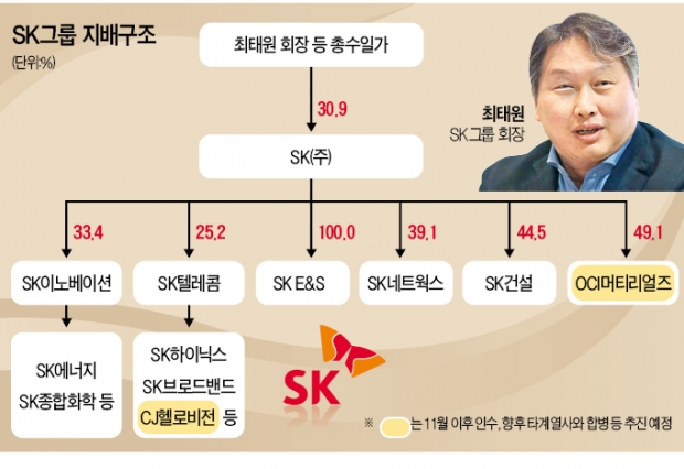 남은 ‘숙제’는 SK하이닉스 등을 중심으로 한 사업구조 개편 작업이다. SK는 공정거래법상 지주회사의 행위제한 규정 때문에 다른 기업들을 M&A할 때 그룹 내 최대 실적을 올리는 SK하이닉스를 인수 주체로 내세우지 못하고 있다. 공정거래법에 따르면 지주회사의 손자회사가 증손회사를 거느리려면 지분 100%를 보유해야 한다. SK는 현재 SK(주)→SK텔레콤→SK하이닉스로 이어지는 지배구조를 갖고 있다.