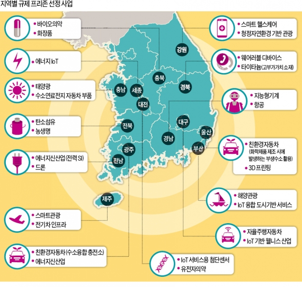 정부는 수도권을 제외한 14개 시·도별로 전략산업을 두 개씩(세종시는 한 개) 지정했다. 지역별로 필요하다고 판단한 산업을 정부에 제출하는 식으로 진행했다. 부산은 해양관광과 사물인터넷(IoT) 도시기반서비스, 대구는 자율주행자동차와 IoT 기반 웰니스산업, 전남은 무인항공기(드론)와 에너지신산업, 경북은 웨어러블 디바이스와 첨단소재 타이타늄 등 미래성장 산업 위주로 선정했다.