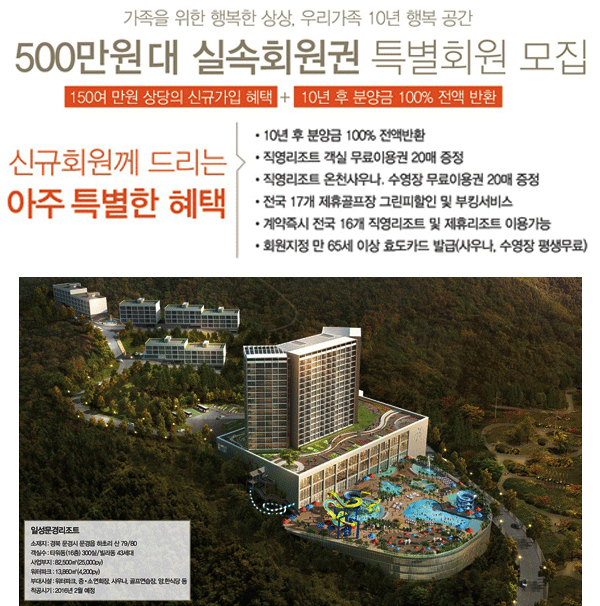일성리조트가 창립 26주년 및 9차 직영리조트 착공을 기념해 정상분양회원권 보다 약 40% 저렴한 가격으로 특별회원을 모집한다. 3,000만원, 4,000만원의 목돈을 들여 큰 맘먹고 구입한 리조트 회원권이 막상 이용하려고 할 때 사용할 수 없다면 아무리 유명하고 시설 좋기로 소문난 회사의 리조트 회원권인들 무용지물 일뿐이다.