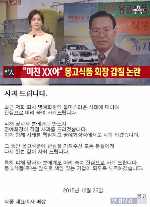 한편 폭행 및 폭언으로 논란이 된 몽고식품 김만식 명예회장은 24일 직접 피해자에게 사과를 하고 사퇴하겠다고 밝혔다.