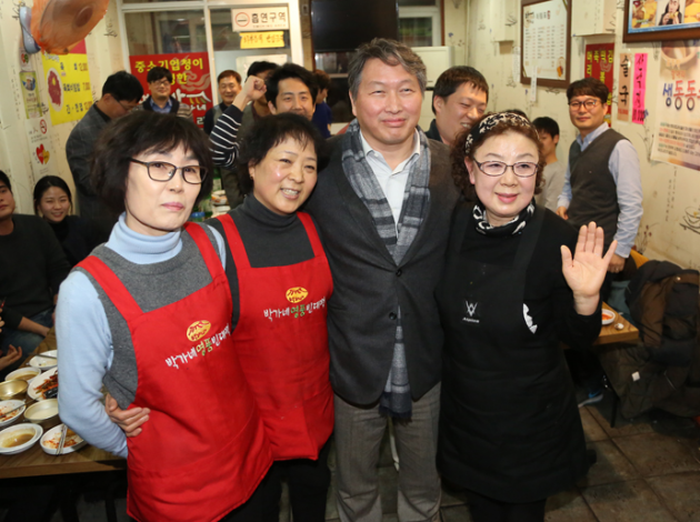 최 회장은 지난 23일 저녁 SK 임직원들의 송년회가 열린 서울 통인시장을 깜작 방문했다. SK 계열사들이 지난 21~23일 동안 전통시장에서 송년회를 개최한다는 얘기를 듣고 임직원들을 격려하기 위해서다.