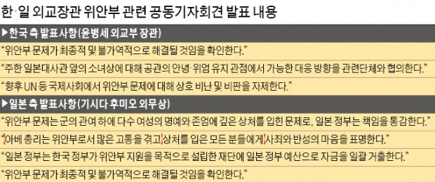 일본군 위안부 문제는 1991년 고(故) 김학순 할머니가 피해 사실을 최초로 증언한 이후 한·일관계의 가장 큰 걸림돌이었다. 양국은 위안부 문제 해결을 위해 작년 4월부터 총 12차례의 국장급 협의와 8차례 외교장관 회담을 했고 1년8개월 만에 최종 타결에 성공했다. 24년간 막혀 있던 한·일관계에 돌파구가 마련됐다는 평가다.