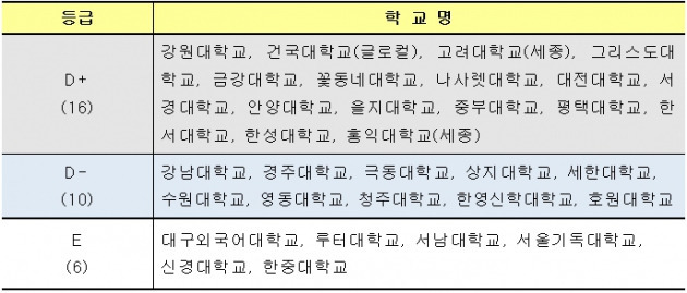 31일 종로학원 평가연구소가 집계한 ‘D·E등급 대학 정시 경쟁률 현황’에 따르면 구조개혁평가 그룹II에 속하는 D~E등급 4년제대 31곳의 평균 지원율은 지난해 5.1대 1에서 올해 4.5대 1로 내려갔다. 서울기독대(E등급)는 경쟁률을 공개하지 않아 집계에서 제외됐다.