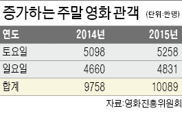 그러나 영화시장은 성숙기에 진입했다는 분석이 나온다. 2013년부터 3년간 총관객 수 증가율은 1% 안팎에 머물렀다. 매출 증가율도 2004~2014년에는 연평균 7%였지만 지난해에는 3.07%에 그쳤다. 영화시장 분석가 김형호 씨는 “매출 증가율이 관객 증가율보다 높은 것은 관람료가 비싼 주말 시간대 관람객이 늘었기 때문”이라고 말했다. 지난해 토·일요일 관객은 2014년(9758만명)보다 3.4% 증가한 1억89만명을 기록했다.