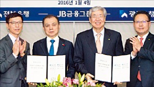 전북·광주은행은 4일 두 은행 영업창구를 공동으로 활용하기 위한 업무 위·수탁 계약을 맺었다. 김한 JB금융지주 회장 겸 광주은행장(오른쪽 두 번째)과 임용택 전북은행장(세 번째)을 비롯한 임직원들이 기념촬영하고 있다. [한경닷컴 바로가기] [스내커] [슈퍼개미] [한경+ 구독신청] ⓒ '성공을 부르는 습관' 한경닷컴, 무단 전재 및 재배포 금지