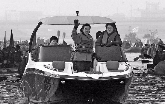 4일 오전 경북 포항시 형산강 조정경기장. 이강덕 포항시장을 포함한 시청 공무원 700여명은 드래곤보트와 수상오토바이 등 90여척의 배에 나눠 타고 송도동 요트계류장까지 4.7㎞ 구간을 항해하는 해상퍼레이드를 펼쳤다.