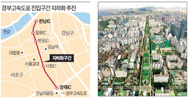 서울 서초구가 경부고속도로 진입부(한남IC~양재IC)를 지하화하는 내용의 일명 ‘나비플랜’(조감도) 공론화에 나섰다. 구(區)유지 등을 매각하고 서초동 롯데칠성 부지 등의 민간 개발사업에서 나오는 공공기여금을 활용해 1조5000억원가량의 사업비를 조달한다는 계획도 세웠다. 서초구는 올해 이 사업 예비타당성 조사를 서울시와 함께 시작할 예정이다.