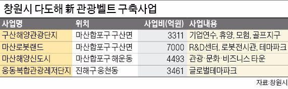시는 우선 해양관광 인프라를 확충하기 위해 324㎞에 달하는 지역의 해안선에 주목하고 있다. 창원시가 중심이 돼 부산~창원~거제~여수·순천을 잇는 ‘남해안 다도해 신 관광벨트’를 구축할 계획이다. 창원이 글로벌 해양관광도시로 거듭나기 위한 구상으로 구산해양관광단지, 마산로봇랜드, 마산해양신도시, 진해웅동복합관광레저단지 조성 등이 핵심사업이다.