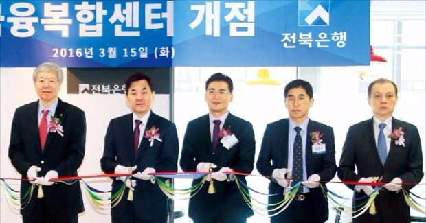 전북은행과 현대증권은 15일 경기 성남 판교신도시에 은행·증권 복합점포를 열었다. 전북은행의 첫 복합점포이자 경기도 두 번째 영업점이다. 김한 JB금융 회장(맨 왼쪽)과 윤경은 현대증권 사장(왼쪽 두 번째), 임용택 전북은행장(맨 오른쪽) 등이 기념행사를 갖고 있다.