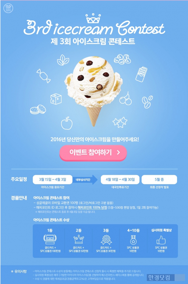 배스킨라빈스가 '제3회 아이스크림 콘테스트'를 오는 4월3일까지 진행한다.21일 배스킨라빈스에 따르면 '제3회 아이스크림 콘테스트'는 지난 2014년부터 진행해 올해 세 번째를 맞은 고객 참여형 이벤트다. 소비자가 직접 참신한 아이디어가 담긴 아이스크림을 제안하고, 이를 실제 제품으로 개발해 보다 새롭고 개성있는 맛을 선보이고자 기획됐다.