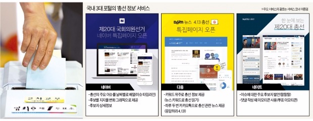 네이버 카카오 SK커뮤니케이션즈 등 국내 인터넷 포털 3사가 다음달 13일 시행되는 20대 국회의원 총선거를 앞두고 최근 특집 페이지를 잇따라 개설했다. 본격적인 총선 체제에 돌입한 이들 세 회사 모두 PC 기반의 인터넷 홈페이지와 모바일 홈페이지를 함께 운영해 유권자들이 언제 어디서나 선거 관련 정보를 손쉽게 접할 수 있도록 한 게 특징이다.