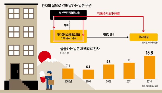 일본우편이 처방약 택배사업에 뛰어들기로 한 것은 재택의료 환자가 늘고 있어서다. 재택의료는 병원이나 의원이 집에 있는 환자를 치료하는 의료체계다. 의사와 간호사가 정기적으로 방문하거나 정보기기(원격진료)를 이용해 검진하고 치료한다. 재택의료는 암, 치매, 골절, 호흡기질환자 등 질병 정도나 종류에 제한 없이 신청할 수 있다.