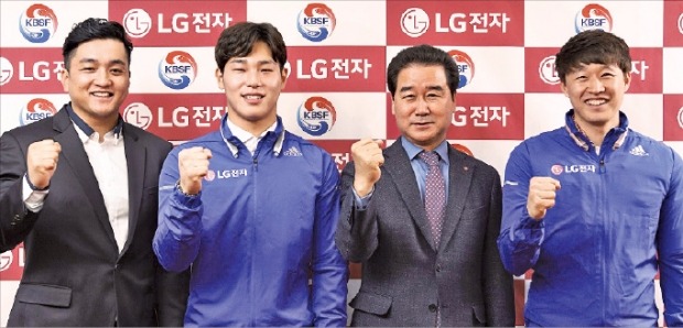 LG전자는 지난 1일 서울 방이동 올림픽파크텔에서 스켈레톤 국가대표팀에 격려금 1억원을 전달했다. LG전자는 지난해 4월 스켈레톤 국가대표팀과 공식 후원 계약을 맺고 2018년 3월까지 각종 지원을 펼칠 예정이다. 왼쪽부터 스켈레톤 국가대표팀의 이진희 코치, 윤성빈 선수, 최상규 LG전자 한국영업본부장 사장, 이한신 선수.